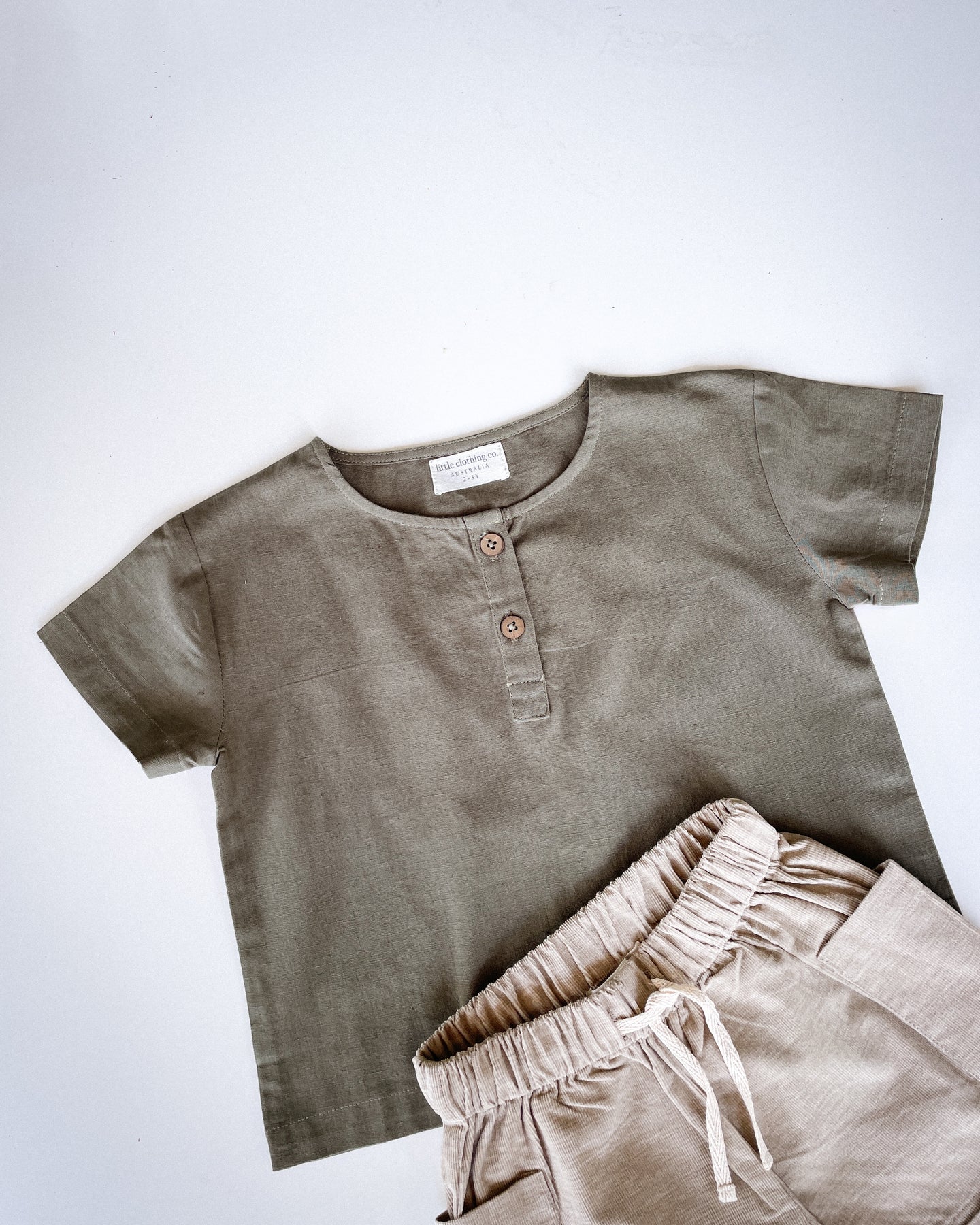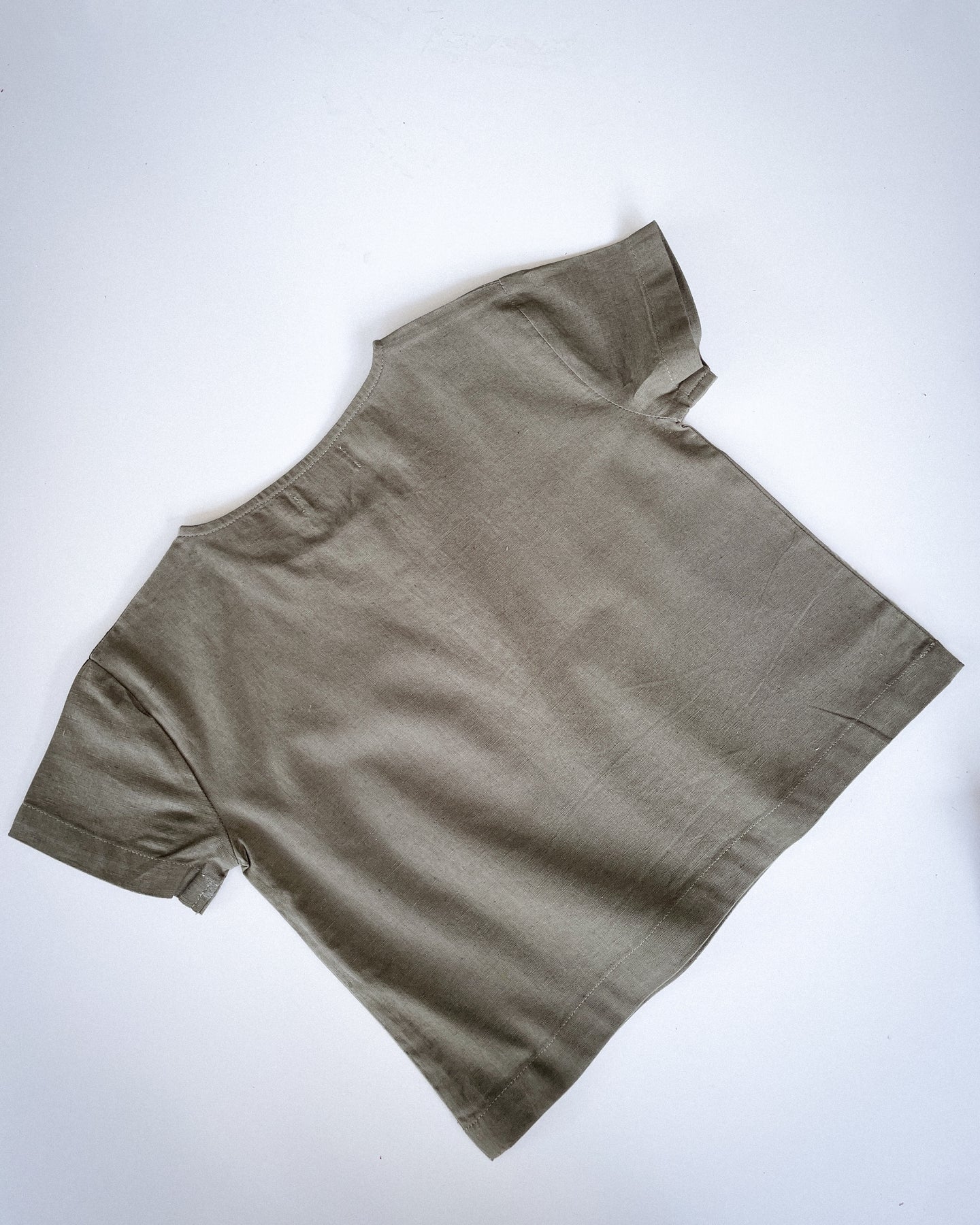 The earthy green shade pairs perfectly with our matching shorts or any neutral wardrobe staples. A versatile, easy-wear piece for play, outings, and everything in between.