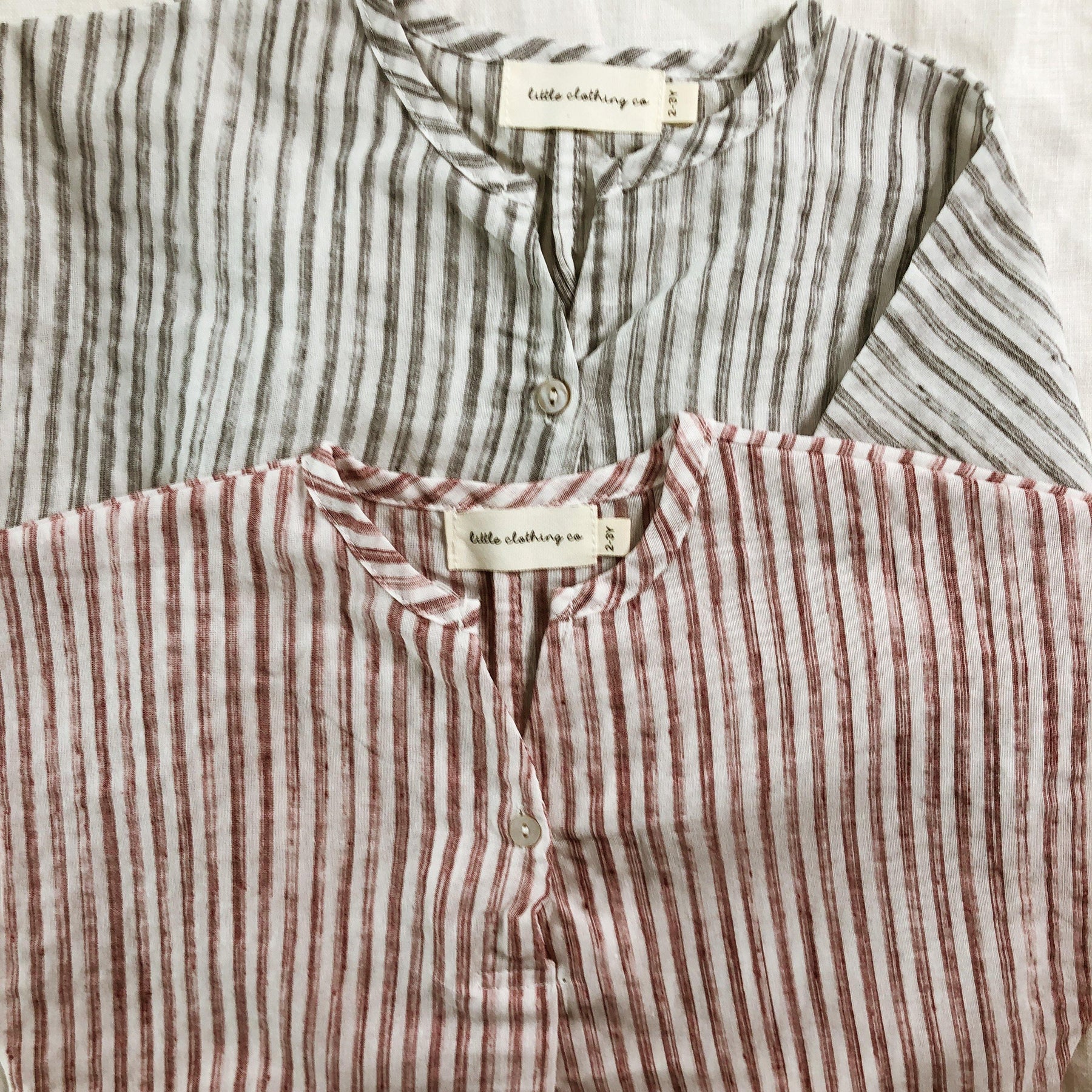 Lightweight, relaxed fit design perfect for warm days. Features a single button, slight V-neck and folded sleeve cuffs. This striped block print fabric is so soft and airy.
