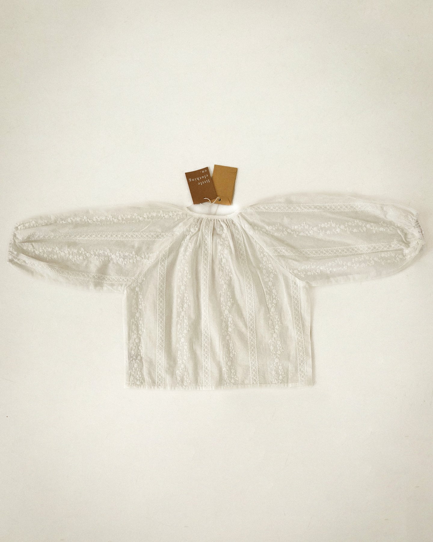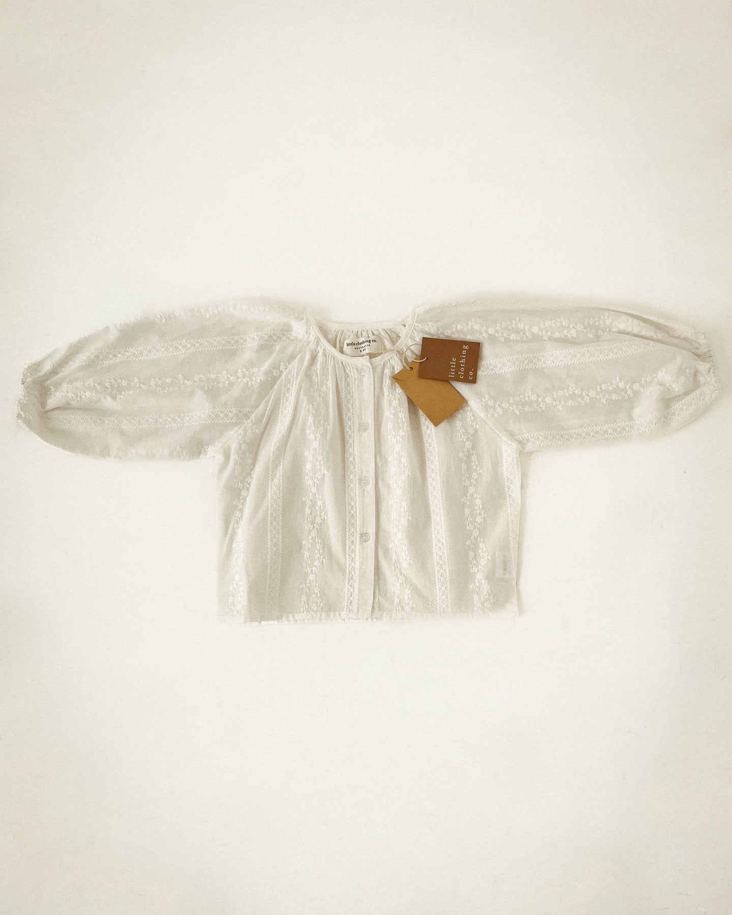 Delicate and timeless, this soft white blouse features vintage inspired embroidery, a softly rounded neckline, and gently puffed sleeves with elasticated cuffs. Finished with a classic button-up front, it’s perfect for dressing up or pairing with everyday favourites. Complete the set with our matching skirt.